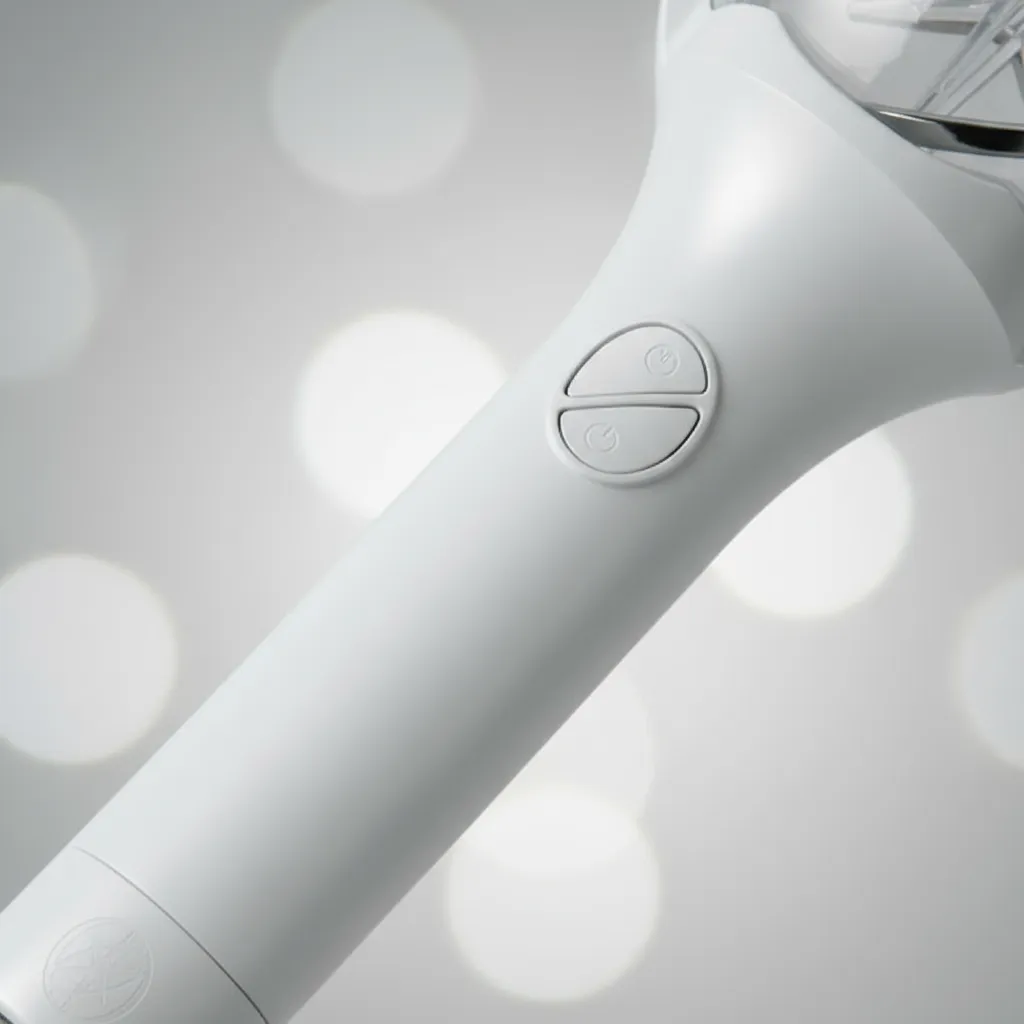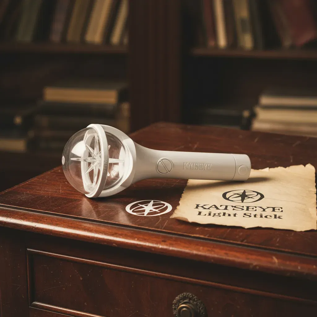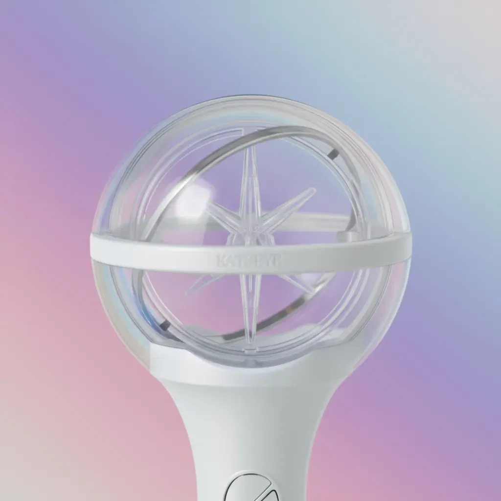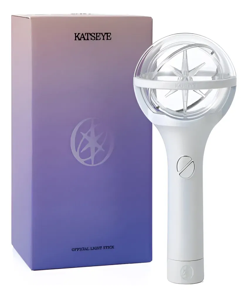 El lightstick oficial de KATSEYE tiene un diseño tipo gema brillante, es ergonómico y ofrece varios modos de luz y colores, incluyendo control por Bluetooth para conciertos; viene con una correa, bolsa anti-polvo y photocards, funciona con pilas AAA.